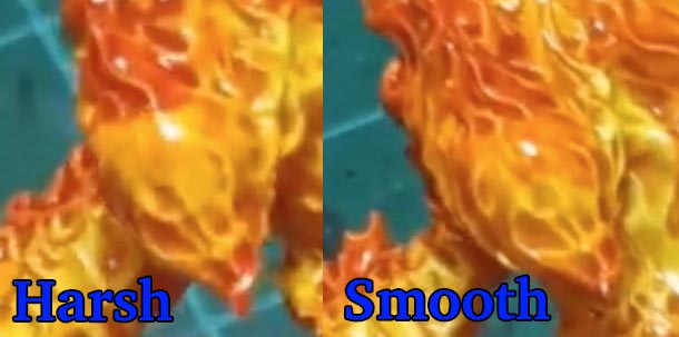 - Wet Blending – Immediately after previous layer is on (do not wait for previous layers to dry), remove harsh transitions. We’re aiming to smoothly transition between adjacent colors. When fixing the transitions, use the color the previous step of the harsh line you see.