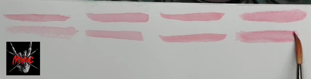 The Miniac compared glaze made from red acrylic paint with a roughly 1:4 mixture of paint to:water, Vallejo Glaze Medium, and Citadel Technical Lahmian Medium. There is also a Vallejo ink combined with Vallejo Glaze Medium. His conclusion, which I agree, is that they’re all basically the same. He does note there’s a red ring for the water glaze and the water didn’t wick off his brush as nicely as some of the other products. My hunch is that ultimately the painter is looking for a specific transparency and they all can achieve that look (with different amounts). This is good news for us, since you now genuinely have substitutes/options.