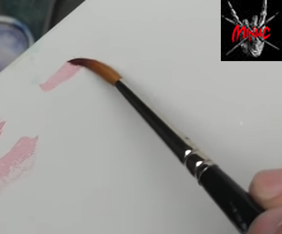 In the picture below, the Miniac gently touches the brush to the paper towel and while drawing it back, he actually twists the brush a full rotation. You can see the twist occurred by looking carefully at the brush bristles.