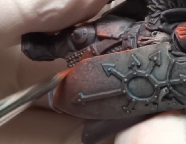 - [Brush] Be sure to edge highlight the insignia relief! Paint the Vallejo Fluorescent Red on the bottom edges of the symbol on the shield. This in particular is a focal point of the miniature (which was why we zenithal highlighted it with more light paint — to make it catch more attention).