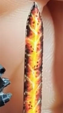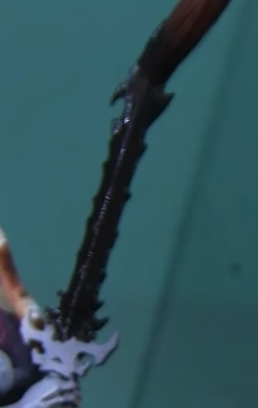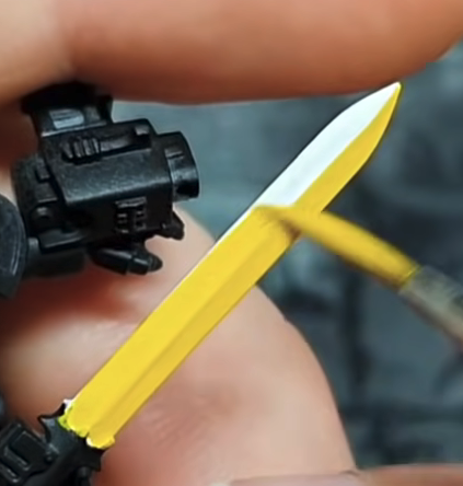 Brush the blend on the edges like an edge highlight but not perfect. In particular dot application with breaks in between to give a rough look. He applies this to the blade edges (using the side of the brush) and the face ridge (this is where the choice of size 0 brush becomes more obvious).