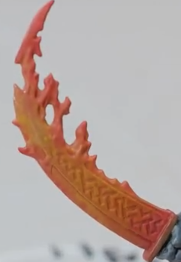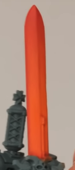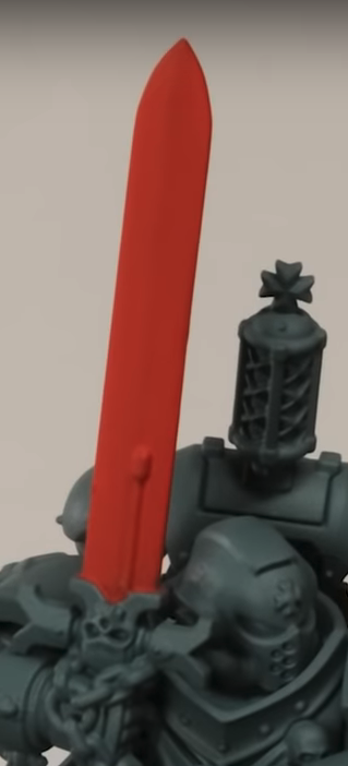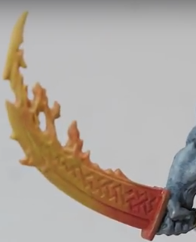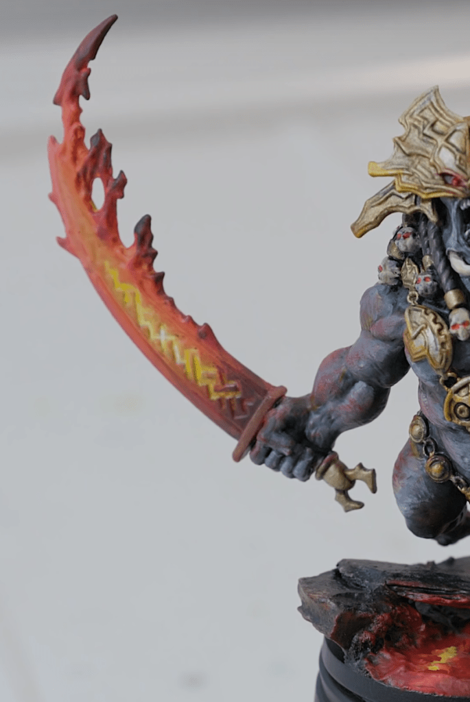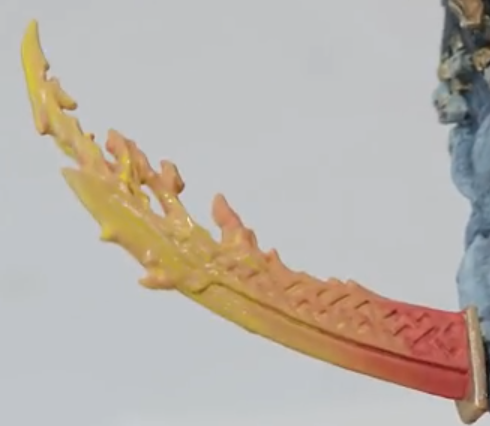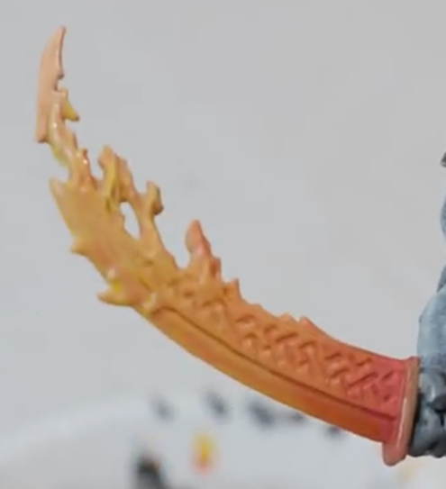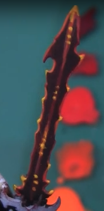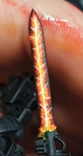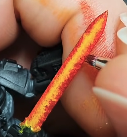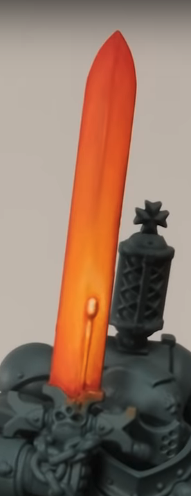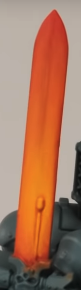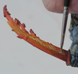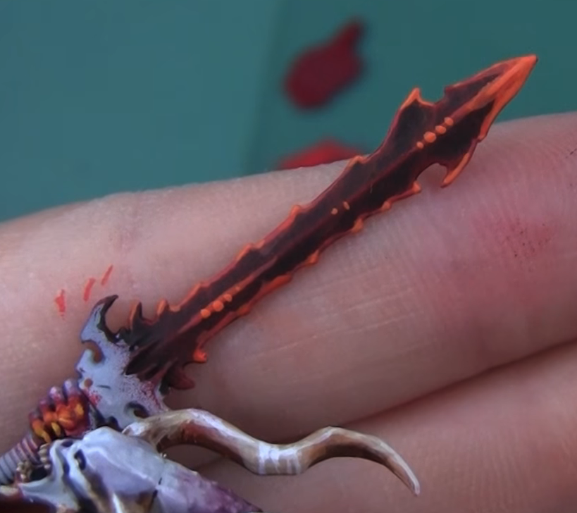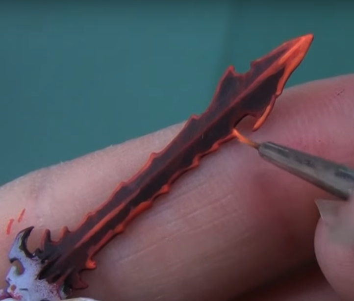Brush Citadel Layer – Flash Gitz Yellow on the very tip of the sword, the tips of the edges on the side, and the centers of the ember dots