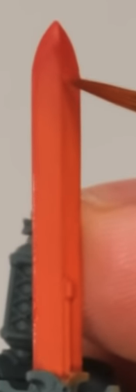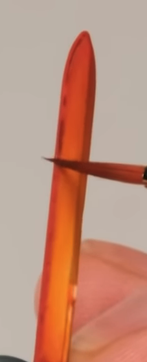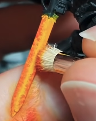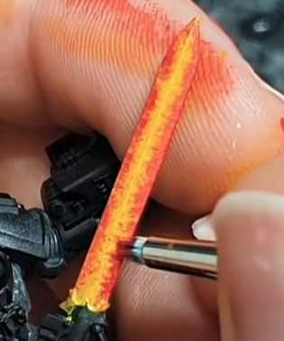 Glaze using Vallejo – Transparent Orange (undiluted) from just above the bottom of the sword up to the yellow. This will help blend the colors. We’re trying to still keep the red at the base and the yellow at the tip